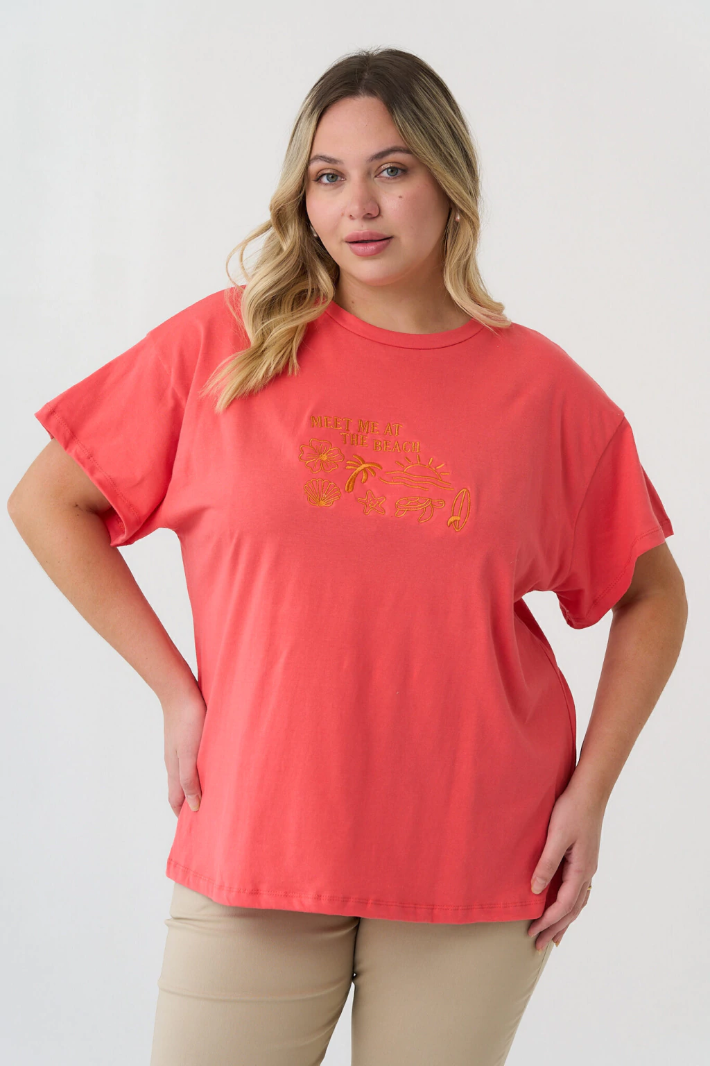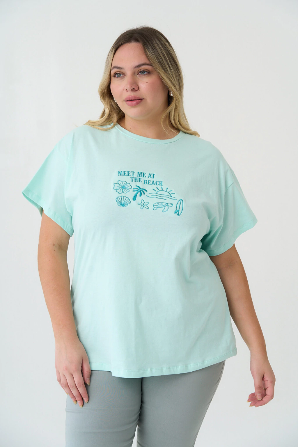 Descripción: Remera manga corta oversize, con bordado delantero MEET ME AT THE BEACH